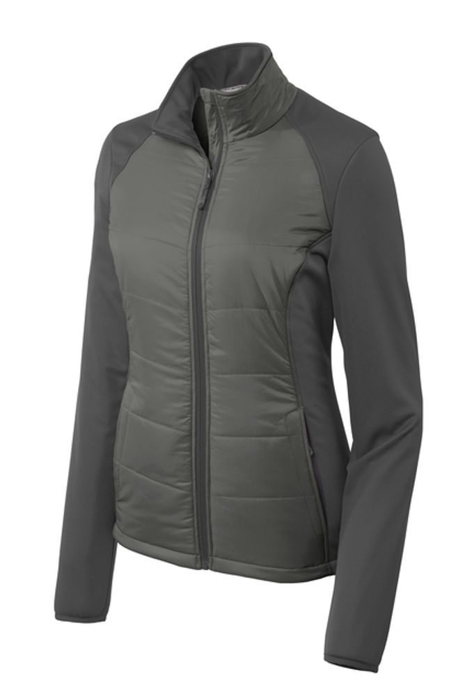 Quilted front and back panels join a water-resistant soft shell to make the Hybrid a trend-right performance jacket with an urban edge. 100% polyester knit shell bonded to a water-resistant film insert and a 100% polyester microfleece interior 100% nylon woven overlays with quilted 4-ounce 100% poly fill insulation at center front and back panels Reverse coil zippers Zip-through cadet collar with chin guard Front zippered pockets Left chest Port Pocket for easy embroidery access Comfort fit binding at cuffs Open hem with adjustable locking drawcords.